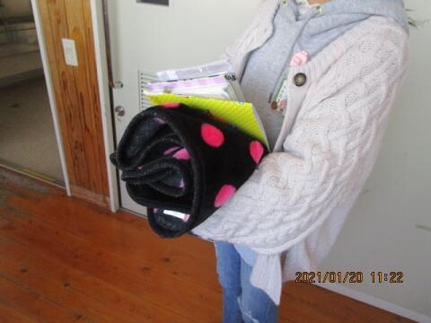 教室移動時に、ひざかけも持参移動です。
