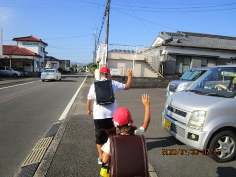 朝から、仲良し兄弟、登校。きちんと手を挙げて、お礼もていねいです。