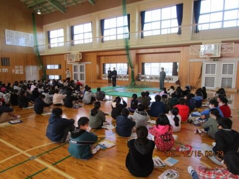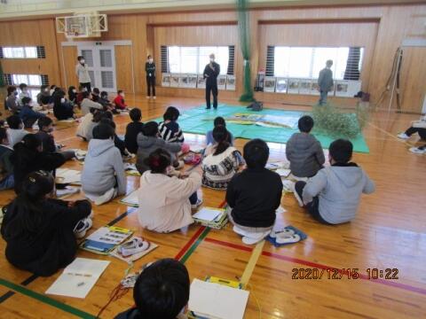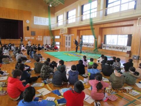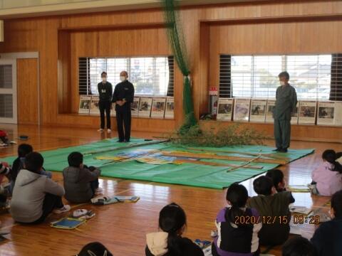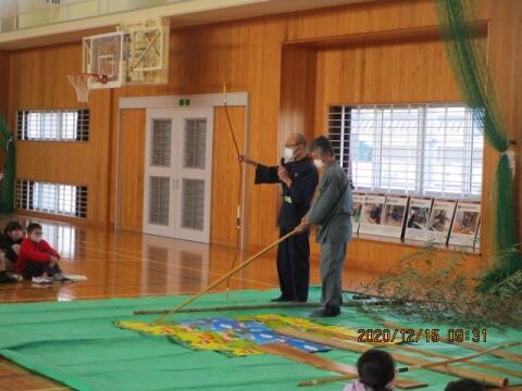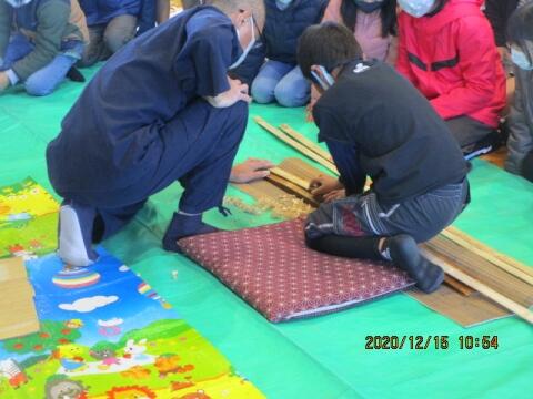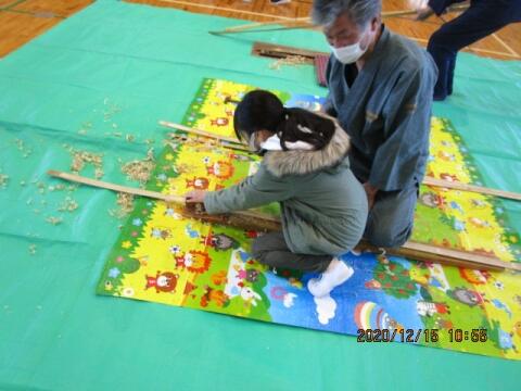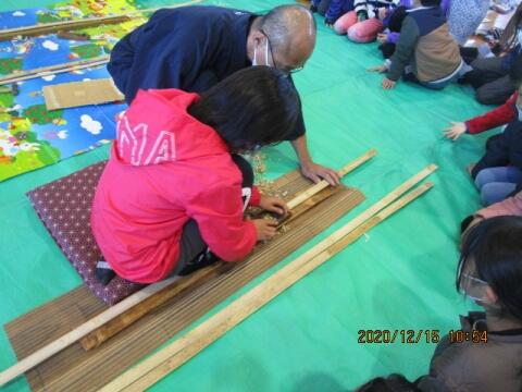 12月15日、4年生を対象に、市役所のご好意の企画で、プロの弓師による「大弓づくり」実演会が行われました。