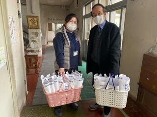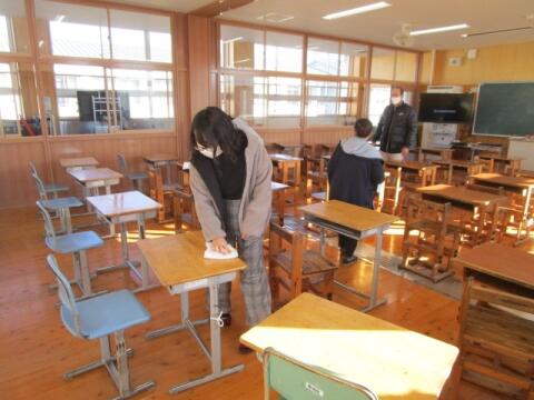 先生方で、机椅子、共有物の消毒。5分の間に仕上げなくてはなりません。