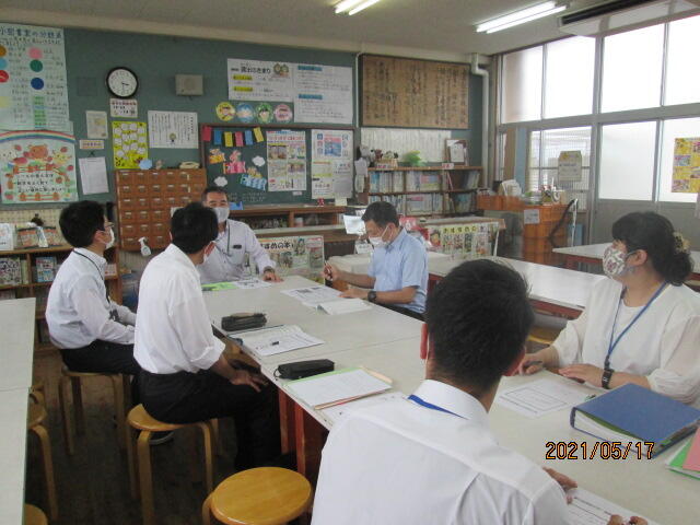 昨日、15時30分から妻ケ丘地区の小中一貫教育を進めていくための第1回担当者会が本校で行われました。妻ケ丘中、東小そして上長飯小の3校の担当者が集まり、今年度の計画や内容について協議しました。新型コロナウイルス感染防止対策として、換気、マスク着用、3密を防ぐための図書室利用、短時間開催とできる限りの対応をしながらの開催でした。