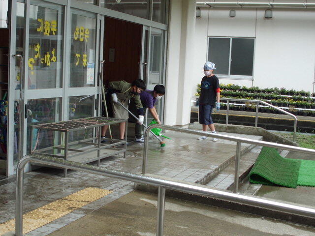 下の写真は、管理棟前の渡り廊下をきれいにしてくれている様子です。廊下の上にあるものも取って掃除してくれていますが、かなり汚れていました。自分たちで汚れている場所を事前に調べて行うので、掃除のやり方も工夫してやってくれていました。