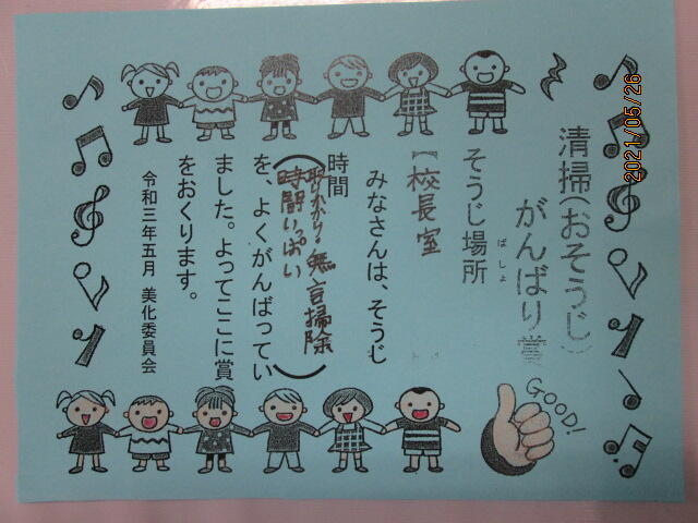 先週の校長室の清掃の取組に対して、美化委員会から「おそうじがんばり賞」が届きました。それぞれの清掃場所でよくがんばった点を明記した賞状を配付してくれました。校長室掃除のみんなも嬉しそうでした。