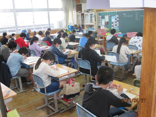 先週の27日(木)の2時間目に、本校に教育実習に来ている大学生の算数の研究授業がありました。教職に就いた者は、みんな経験することですが、大学での座学の学びを実践につなげる貴重な機会です。