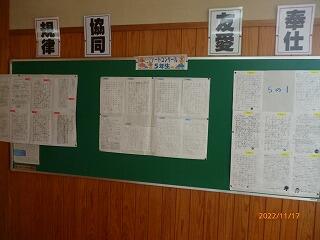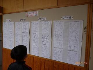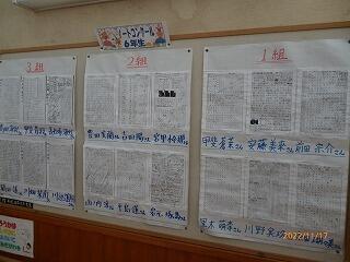学級ごとに、「丁寧に書いている」「すき間なく書いている」「工夫が見られる」という基準のもと、選考されたノート(コピー)が廊下に展示されています。展示されているノートを見て「上手だなあ。」とか、「とても見やすいなあ。」などとつぶやいている様子が見られました。