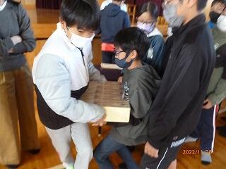 学習のまとめに、1億円(1万円札が1万枚)のレプリカ(複製品)を見せてもらいました。実際に持つこともでき、約10キロの重さに驚き、感動していた6年生でした。