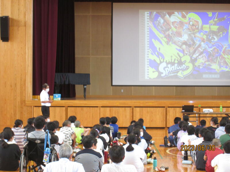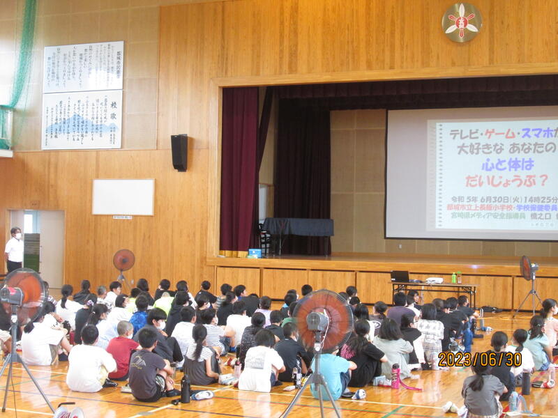 講話では、市教育委員会生涯学習課社会教育指導員の橋之口修先生を講師にお迎えし、「メディアの使用について」という視点から、様々なことを教えていただきました。児童が体育館を退出した後は、保護者向けにも注意点などを教えていただきました。