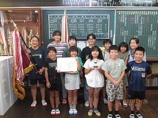 9月2日に行われた第45回県南少年少女選手権大会において、見事に優勝をかざり、優勝旗、優勝盾、賞状を校長先生から渡していただきました。日頃の練習の成果が発揮され、自信もついたのではないでしょうか。