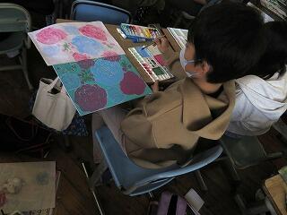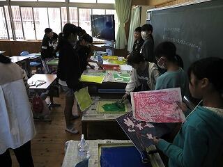 6年生は高度な技法である多色刷りの版画に挑戦していました。彫った部分を白く残すため、薄い色から濃い色へと慎重に色を重ねて刷り、深みのある複雑な表現を追求していました。