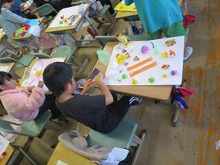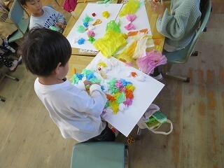 一方、1年生は、色とりどりのお花紙を使って絵に表しました。 いつも違ってやわらかいふんわりするお花紙の感触を味わいながら、丸めたり、ちぎったり、ぎゅっと握ったりして、紙に貼っていきました。作品一つひとつに、子どもたちの自由で楽しい世界が広がりました。