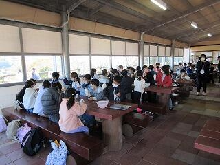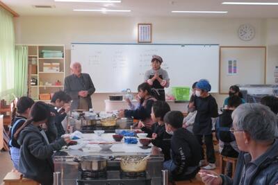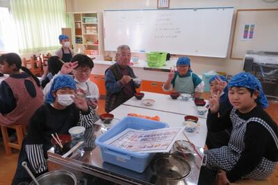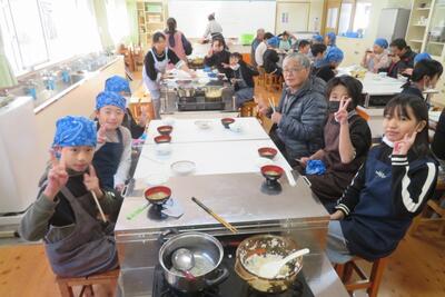 田植えや稲刈り、脱穀など、5年生の様々な学習活動を支援してくださっている「ふるさとの会」のみなさん。田んぼの水の管理や草刈り等もしてくださっていたことに感謝し、家庭科の調理実習で作ったご飯とみそ汁を一緒に食べながら、歓談しました。