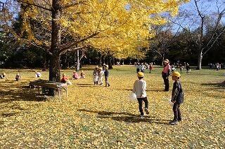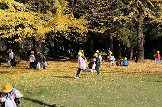 イチョウの葉が美しく黄色く色づき、その光景に1年生は大喜びです。早速持ってきた袋いっぱいに落ち葉を拾い集めました。