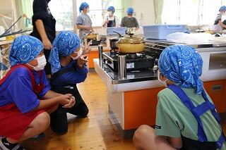 お米は、先日みんなで収穫した新米を使用しました。透明な鍋でご飯を炊いたため、普段は見ることができない炊飯の様子をじっくりと観察することができました。「お米が踊っています!」と、子どもたちは興奮した様子で、お米が炊きあがるまでの変化を教えてくれました。