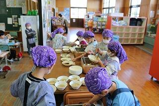 教室に運び終えると、配膳の準備を先生の手を借りずにテキパキと進められる姿は見事です。「おいしくなあれ」と声をかけながら、協力し合って準備する姿は、本当に頼もしい限りです!