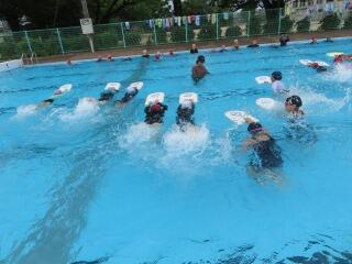 頭の位置、ひじを伸ばす、などなどコツをつかむために、繰り返し練習しています!短い時間の中でみんな一生懸命泳いでいます。子ども達同士で教え合う姿もあって、苦手な子も得意な子もみんな楽しくがんばっています!!