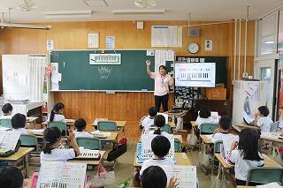 1年生は、タブレットを使いながら思考力と語彙力を高める言葉の学習をしていました。 学習プリントに付いているQRコードをタブレットで読み込むと、画面にサイコロが出現。「主語(~は)」「目的語(~を)」「述語(~する)」のパーツをサイコロの目で選び、文を完成させるというゲーム感覚の活動です。 「わたしは ほんを たのしむ」といった文や、「あかちゃんが パソコンを もらう」といったユニークで想像力あふれる文ができあがり、教室は大きな笑いと発見で大いに盛り上がりました。ICTを活用し、楽しみながら言葉のきまりを学んでいます。