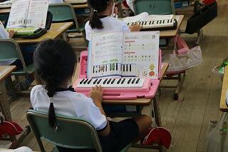 鍵盤ハーモニカを使い、「ドレミ」の位置を一つひとつ確認し、ゆびづかいに気をつけながら音出しに挑戦していました。