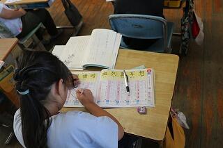 教室では、漢字の練習とともに、国語辞典を使っての意味調べに取り組んでいました。今、子どもたちはタブレットPCを使えば意味を簡単に調べることができます。しかし、国語辞典を「引く」作業を通して、辞書の使い方や調べる習慣を身につけることも、大切な学習の一環です。アナログとデジタルを効果的に使い分けながら、知識を定着させていきます。