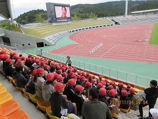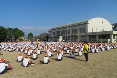 曇り空で肌寒く感じる中、全校体育がありました。運動会がいよいよ10月25日に迫っており、各学年の練習も毎日熱が入っています。今日の全体練習では、スムーズな進行のため開会式・閉会式の移動やリレー選手の入退場を確認しました。特に全校リレーでは、本番さながらのバトンパスの練習を行い、熱のこもった走りを見せました。