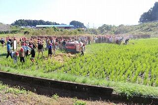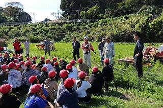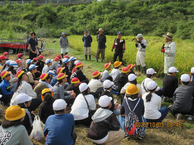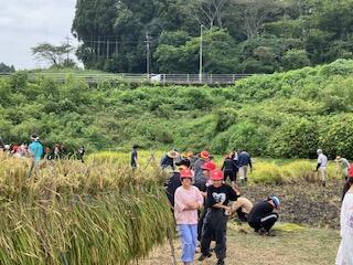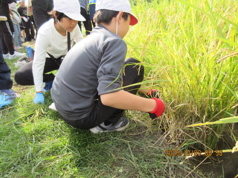 なかなか思うように刈れない子どももいましたが、優しく教えていただきながら、広い田んぼの稲を刈ることができました。