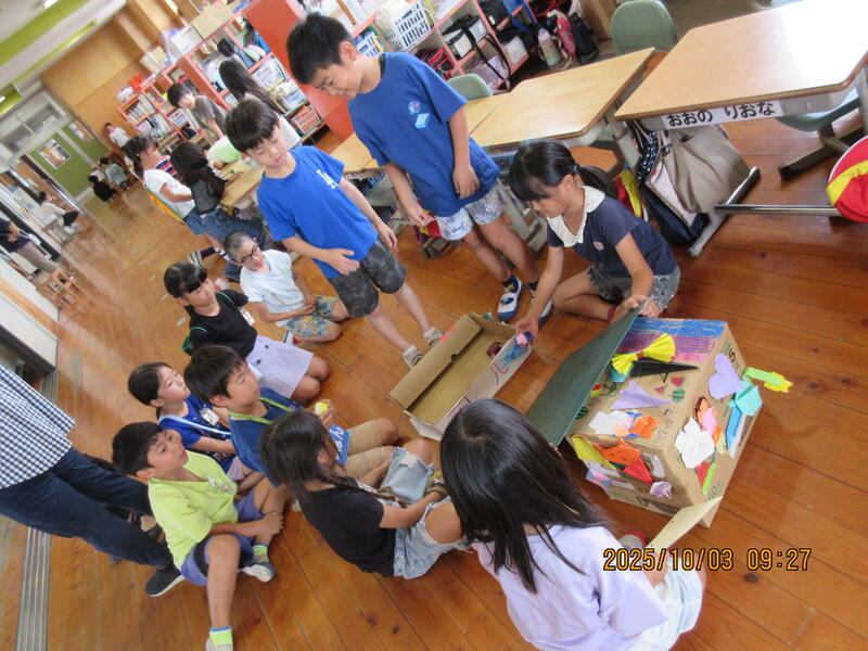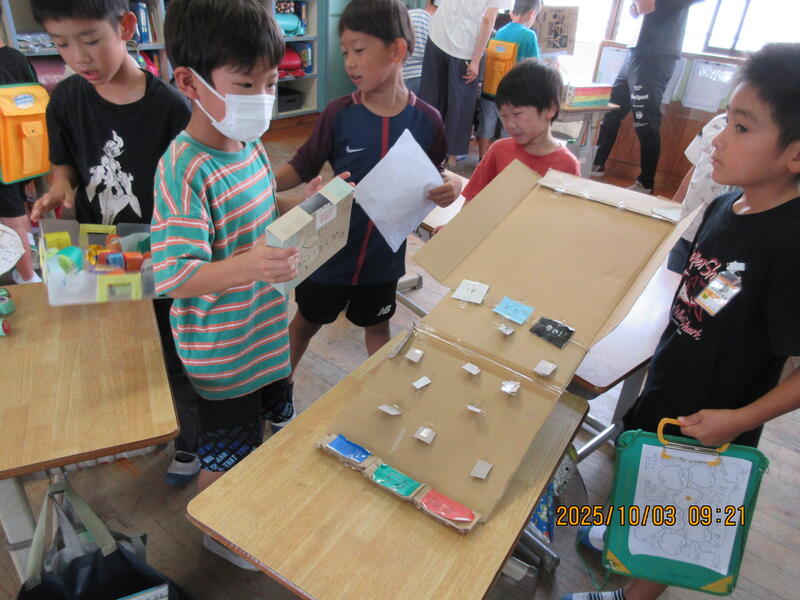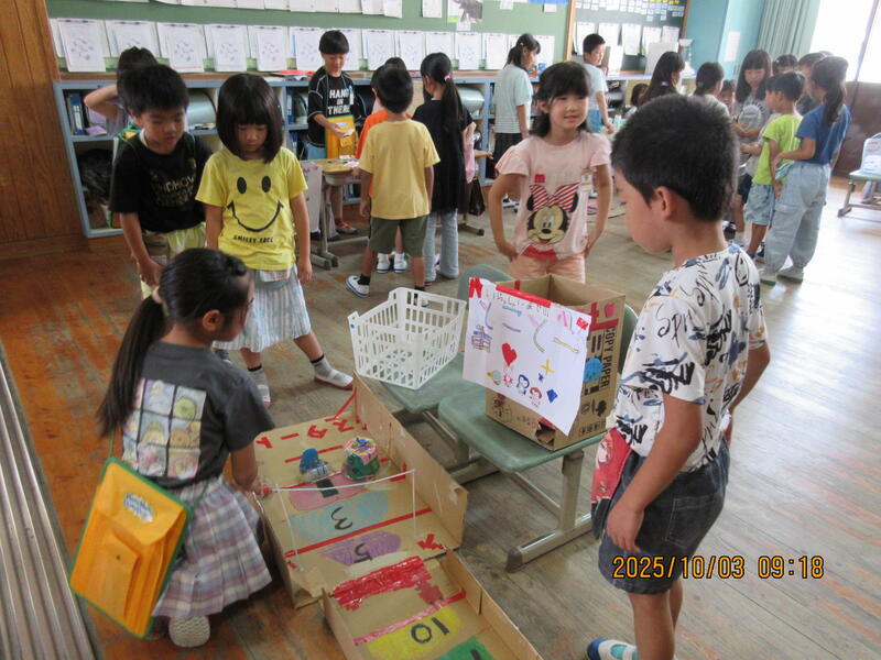 2年生教室では、1年生を招いてのおもちゃ祭りが行われていました。