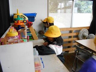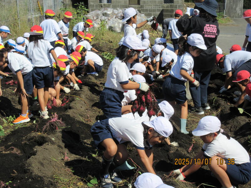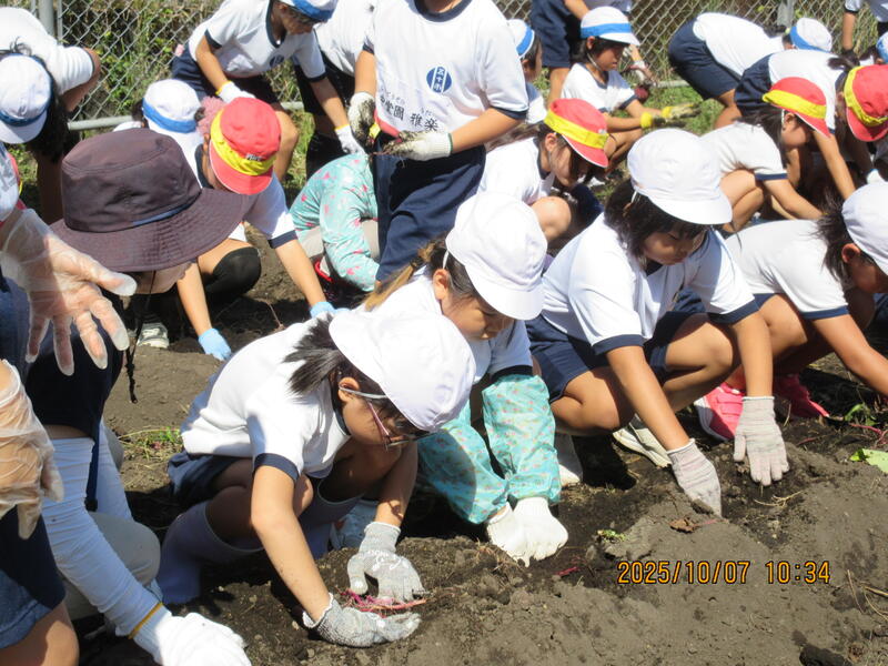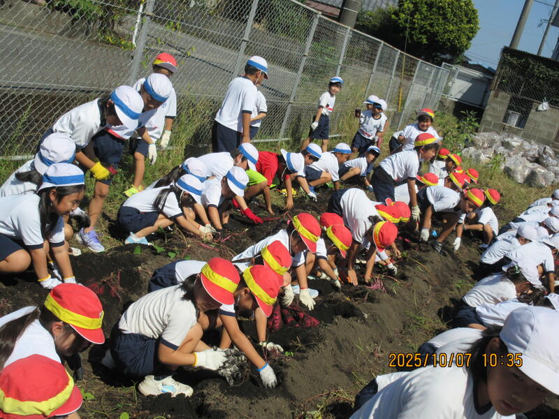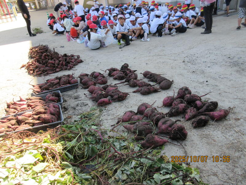 畑には、春に植えたサツマイモが、大きくきれいに実っていました。子どもたちは、つらなる大きなサツマイモに歓声をあげながら、楽しく活動していました。掘ったサツマイモは、お家にもって帰るとのこと。お家の方と一緒に美味しく食べてくださいね。