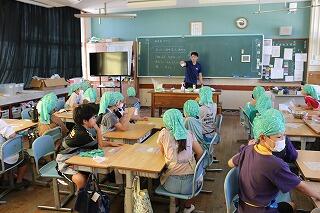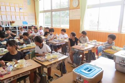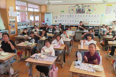 田植えや稲刈り、脱穀など、5年生の様々な学習活動を支援してくださっている「ふるさとの会」のみなさん。田んぼの水の管理や草刈り等もしてくださっていたことに感謝し、家庭科の調理実習で作ったご飯とみそ汁を一緒に食べながら、歓談しました。