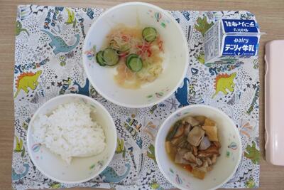 今日の給食のメニューは、白ご飯、秋野菜の煮物、春雨サラダでした。地産地消の日ということで、煮物には、さつまいもが入っていました。さつまいもは、やわらかくて甘くておいしかったです。食欲の秋ですね。