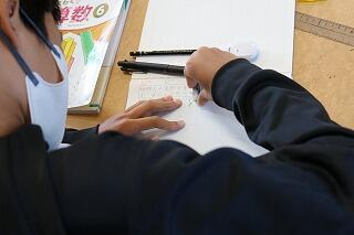 1年生が算数の時間に、文章問題に取り組んでいました。いつもはブロックを使って数を数えますが、今日は頭で考えたことを整理するために、ブロックを使わずにノートに〇を書いて問題を解いていました。試行錯誤しながら、自分の考えをしっかりとノートに表現し、筋道を立てて考えることができていました。