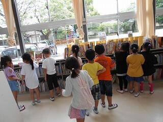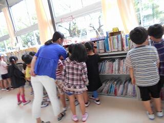 初めての図書室では本がたくさんあることにびっくりでした。図書室の利用の仕方を学んで、いよいよ借りる本を選びます。たくさんの本があって選ぶのも大変です。図書館サポーターの先生に手伝ってもらって本を選んでいました。これからたくさん本を読んでほしいですね。
