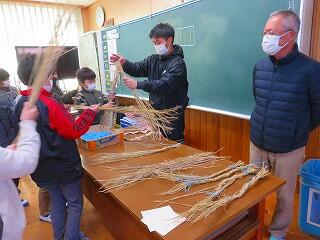 先日、ふるさと支援ボランティアの方が3名来られて、しめ縄づくりを行いました。「先生、むずかしいです。」とボランティアの方々に声かけしていました。時間がたつにつれて上手にできるようになりました。