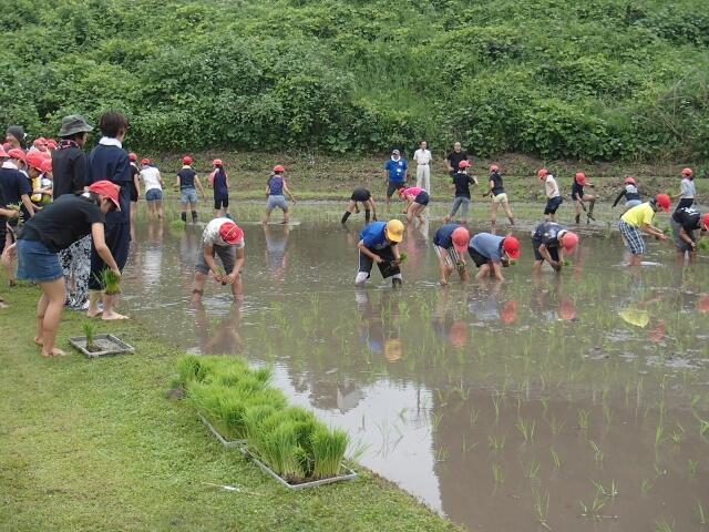 6月10日(金)に5年生みんなで田植えを行いました。地域のみなさんの力や保護者の皆さんの力もかりて、無事に終えることができました。昨年度からはじめた、地域の皆さんへの感謝も兼ねて、収穫祭には、およびして、一緒に収穫を喜びたいと思っています。