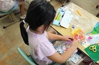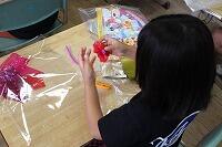 21日(金)に、1年生は図工の時間に「ひかりのくにのなかまたち」という学習に取り組んでいました。材料は、ビニール袋やカラーセロハン、モールなどで、子どもたちは、ビニール袋の中にカラーセロハンを詰め込み、モールでしばって形を作っていて、とても楽しそうでした。花や魚、熊など色鮮やかな可愛らしい作品ができて、キラキラした笑顔で友だちと見せ合っていました。