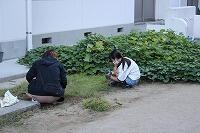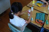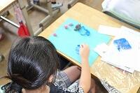 1年生が育てているアサガオの花を使って、色水づくりとたたき出しをしていました。紫色の花びらを水につけておくと、きれいな紫色の色水ができました。そして、アサガオの花びらを直接、用紙にたたくように押しつけることで、アサガオの花そのままの色がきれいに表現できていました。