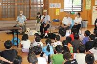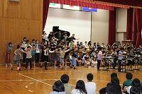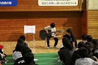 全校児童が体育館に集まり、みんなわくわくした雰囲気の中、いよいよ音楽鑑賞教室のスタートです。子どもたちが聞いたことのあるアニメやゲーム、SNSで流行した曲などが演奏され、みんなで手拍子をして盛り上がっていました。途中で楽器紹介もあり、にこにこ笑顔でとても楽しそうな様子でした。