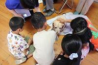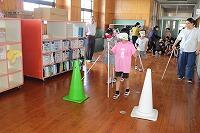 また、子どもたちは、盲導犬と触れ合わせていただいたり、白杖を使っての歩行体験をさせていただいたりしました。