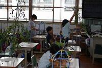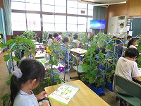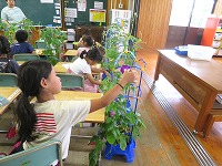 10日(水)に、2年生は生活科の時間に自分たちで育てている野菜の観察して記録していました。中には、自分の身長よりも大きく育ったミニトマトもありました。子どもたちは、ピーマンや茄子、ミニトマトなど自分で選んだ野菜に顔を近づけながらじっくりと観察して、色や大きさ、形など成長した様子を自分の言葉で記入していました。