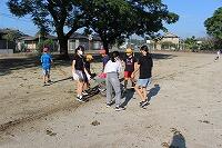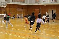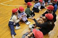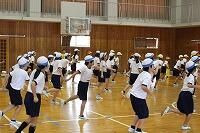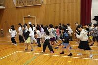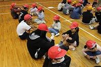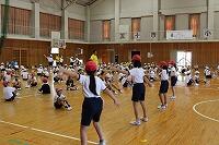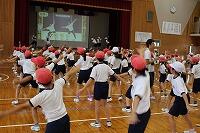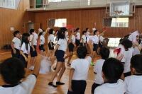 初日となる今日は、1年生と6年生の2クラスずつが昼休みの時間に体育館で、自己紹介カードを交換した後、「しっぽ取りゲーム」をしました。子どもたちは、友だちが腰に付けた赤白帽子を取ろうと一生懸命に走り回って、とても楽しそうでした。