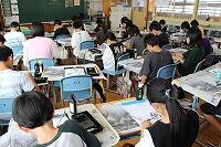 8日(金)に、5年生は、川の流れとその働きのついて学習していました。先生から出題された「上流の水の量は少ないのに、下流に行くと増えるのはなぜか?」という問題を、子どもたちは一生懸命に考えていました。今回の学習では、自分たちが住んでいる都城市を流れる大淀川について、みんなで防災マップを囲んで調べたり、個人でタブレットを使って地図で調べたりする姿が見られました。