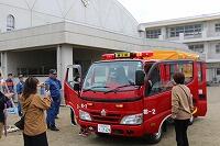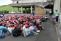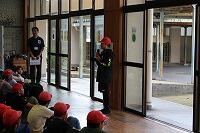 まずは、消火器訓練やホースを使った放水訓練を行いました。消火器訓練は避難訓練でもやりますが代表児童だけです。子どもたちは本物のホースでの放水訓練に目を輝かせていました。
