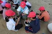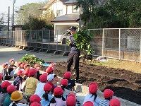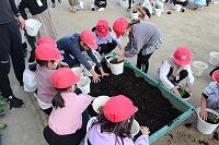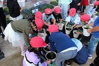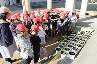 子どもたちは、先生から花を植える目的や手順についての話をしっかりとした態度で聞き、花を優しく丁寧に植えていました。