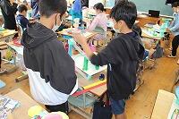 14日(木)に、5年生は図工の時間にカラフルな段ボールを使って工作をしていました。