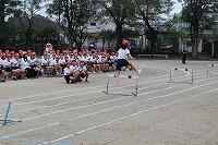 校内陸上教室では、50mハードルや中距離走、400mリレーなどのトラック競技や、走り幅跳びやソフトボール投げなどのフィールド競技が行われました。子どもたちは下級生や先生方、保護者の方々の応援を背に受けながら、最後まで一生懸命に取り組み、学級の枠を超えて息の合った応援でとても盛り上がった陸上教室となりました。