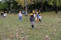 子どもたちは、秋になり赤や黄に色付いた落ち葉などを見つけては、先生や友だちに見せたり、大切に袋に入れたりしながら秋を楽しんでいました。