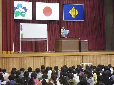 給食委員会の子どもたちが、給食の歴史や食器かごの持ち方をクイズにして発表しました。