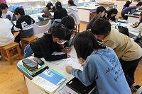 8日(金)に、5年生は、川の流れとその働きのついて学習していました。先生から出題された「上流の水の量は少ないのに、下流に行くと増えるのはなぜか?」という問題を、子どもたちは一生懸命に考えていました。今回の学習では、自分たちが住んでいる都城市を流れる大淀川について、みんなで防災マップを囲んで調べたり、個人でタブレットを使って地図で調べたりする姿が見られました。