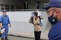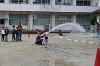 まずは、消火器訓練やホースを使った放水訓練を行いました。消火器訓練は避難訓練でもやりますが代表児童だけです。子どもたちは本物のホースでの放水訓練に目を輝かせていました。