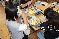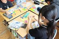 また、6年生は図工の時間にランプシェードを作っていました。子どもたちは、自分で形やデザインをイメージしながら、プラスチック製の段ボールを切ったり、穴のあけたりして、カラーシートを貼っていました。どの作品も工夫されていて、中からライトで照らしてみるとどんな灯りになるか楽しみです。