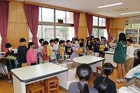 子どもたちは、これまでみやだいずについて調べ学習を行い、味噌づくりを体験したり、学級園でみやだいずを育てたりしていますが、講師の方の話を聞きながら「えーっ」という声が聞かれ、新たな発見もあったようです。
