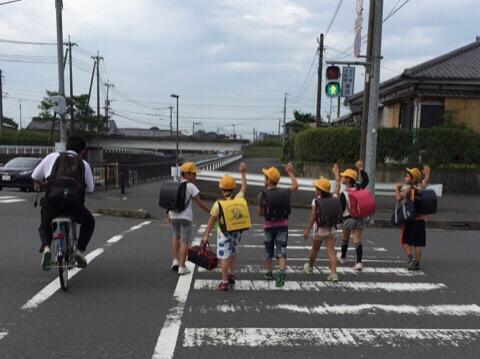 この登校班は、しっかり手を挙げて渡ることができています。